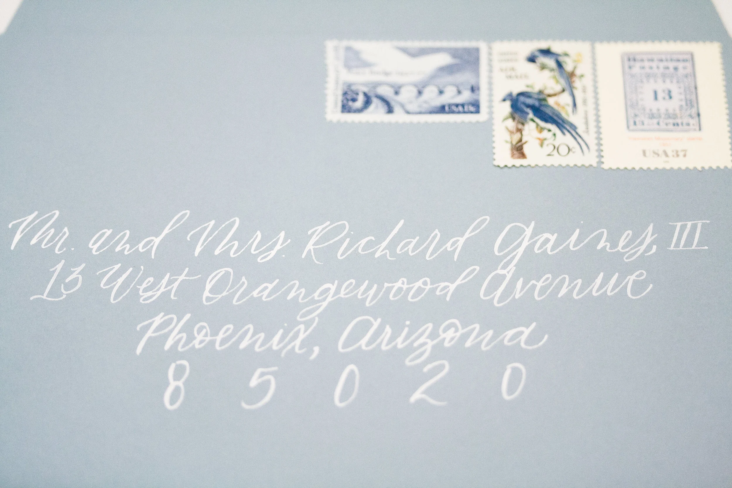 Custom postage is printed on adhesive labels, and can feature any design you choose. I like to pull a floral motif or your monogram, to ensure the entire suite is cohesive. Custom postage allows you to have total control of your finished product; no more searching for a stamp that looks “okay” with your invitations!