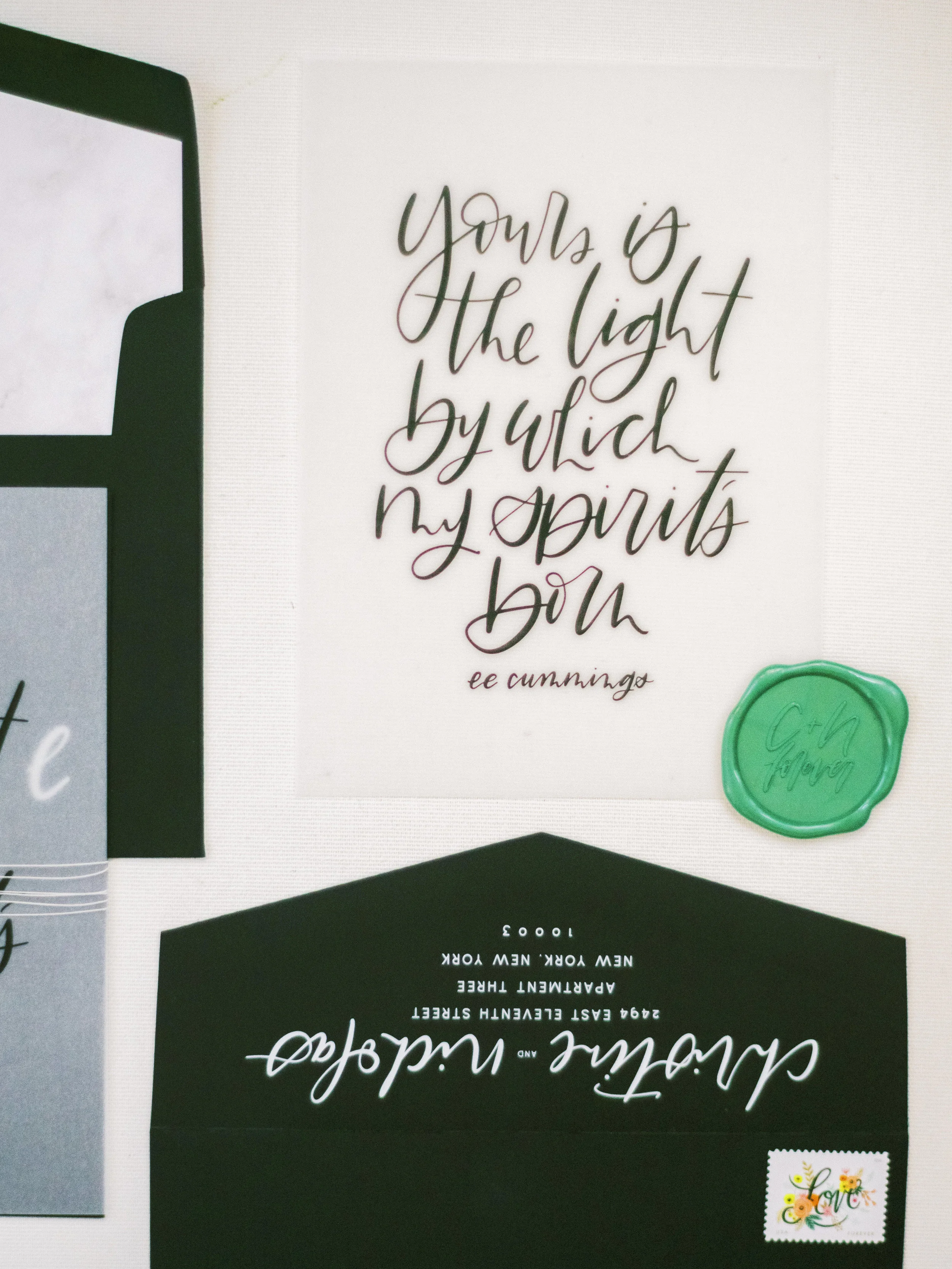 Instead of printing guests’ addresses on your envelopes, the addresses can be calligraphed with a pointed pen or drawn with a brush. It’s a romantic touch that is traditional while also very modern. Your guests will feel extra-special!