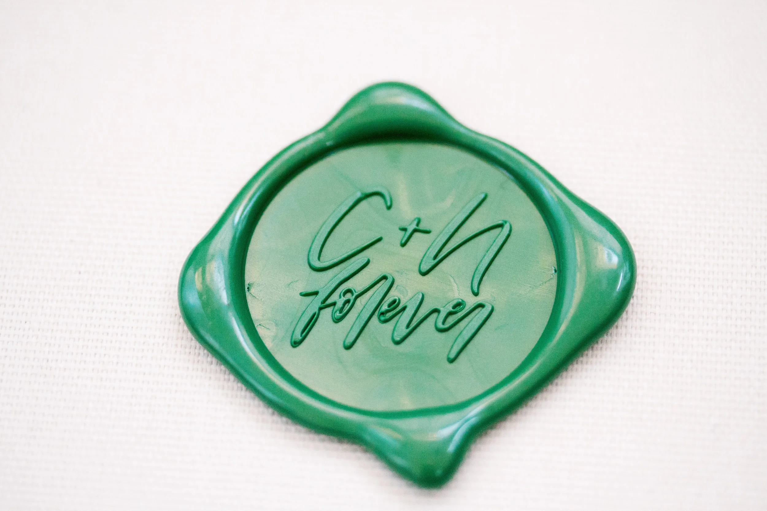 Custom wax seals feature a design unique to your invitation suite; this can be a monogram, your venue illustration, a word that is special to you, etc. Wax seals are provided with an adhesive back to allow for easy assembly, and come in a variety of colors and sizes.